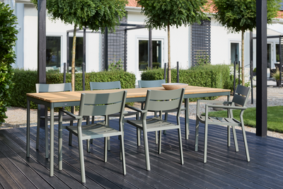 Mulighederne er mange med dette udendørs spisebord i høj kvalitet. Stel i pulverlakeret aluminium og bordplade i smuk bambus. Bambus er et naturmateriale, der kræver pleje for at bevare sin rige og smukke overflade i mange år.