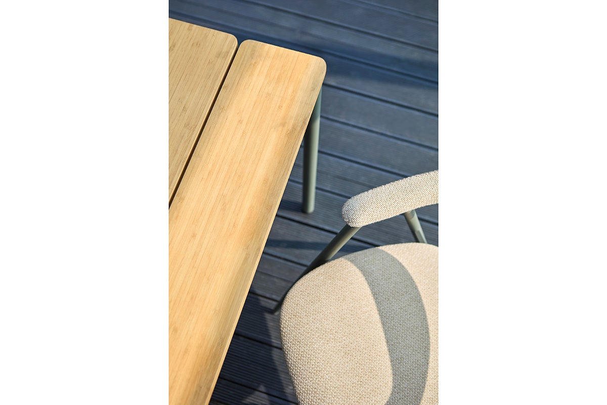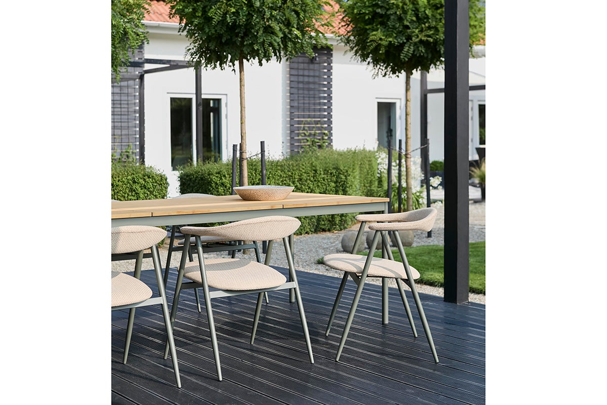 Boi, stolen som kombinerer komfort og holdbarhed med en robust stålramme og afsmalnede ben, der giver både stabilitet og et moderne, sofistikeret udseende. Stolen er lavet til udendørs brug og står stabilt, samtidig med at den tilbyder et slankt, nutidigt design. Det smukt buede ryglæn giver ikke kun ekstra støtte, men tilføjer også til designet. Håndsyede sømme.