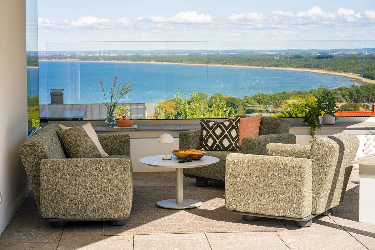 Bolster kombinerer indbydende komfort med udtryksfuldt design. De fuldpolstrede former, generøse hynder og robuste ben giver serien sin unikke karakter, mens det robuste aluminiumsstel i antracit sikrer langvarig holdbarhed. Det vandafvisende TPU-stof gør sofaen vejrbestandig. Hynderne fås i vores Teddy-stof, i farver, der forstærker følelsen af en eksklusiv udendørs lounge. Hynderne er nemme at fjerne og opbevare. Bolster udvisker grænsen mellem inde og ude – følelsen af en indendørs sofa, der er skabt til livet udendørs.