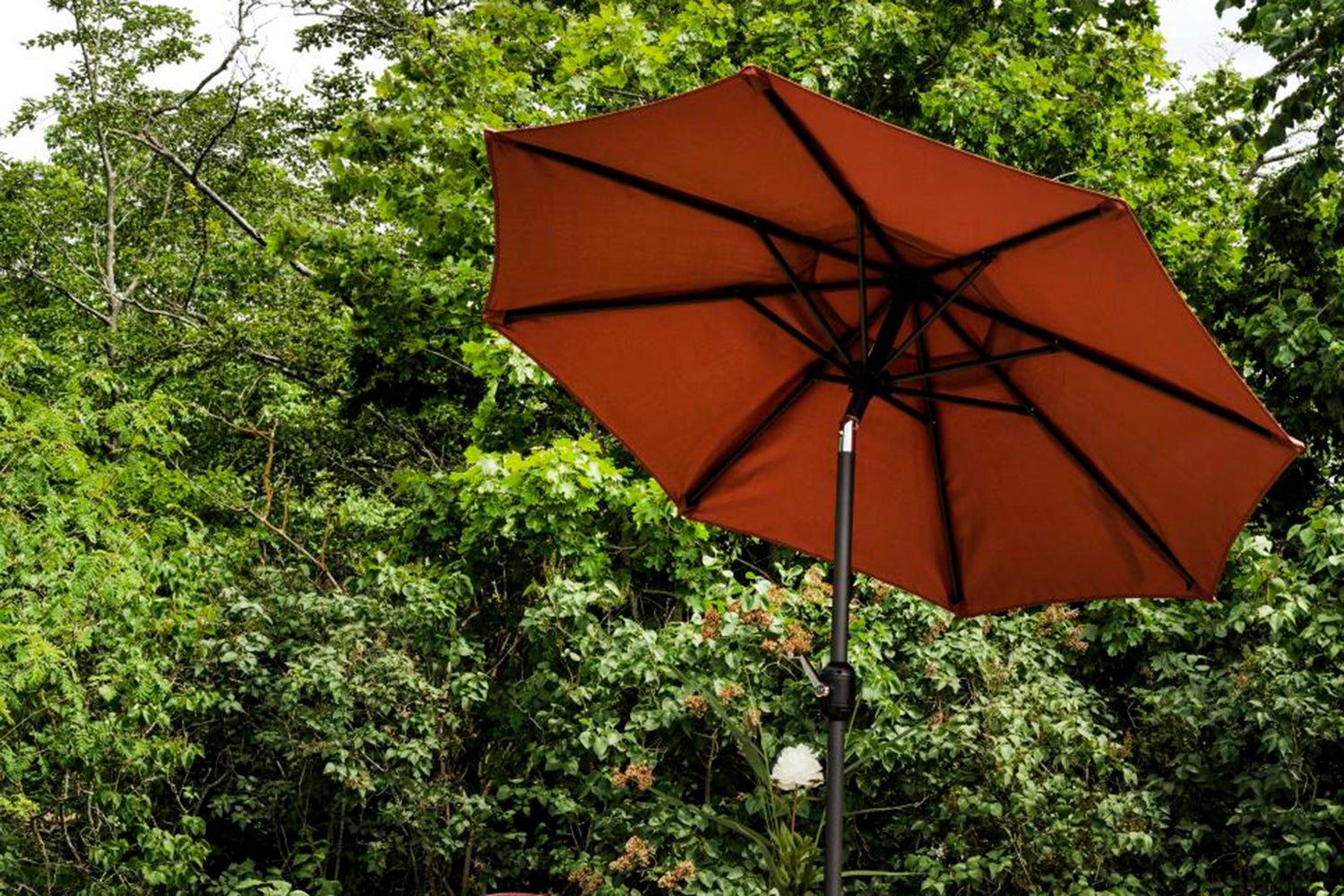 Parasoll med 2-delad stång i aluminium och 8 stålribbor. 200 gr polyesterväv med ventilationslucka. Vevfunktion.