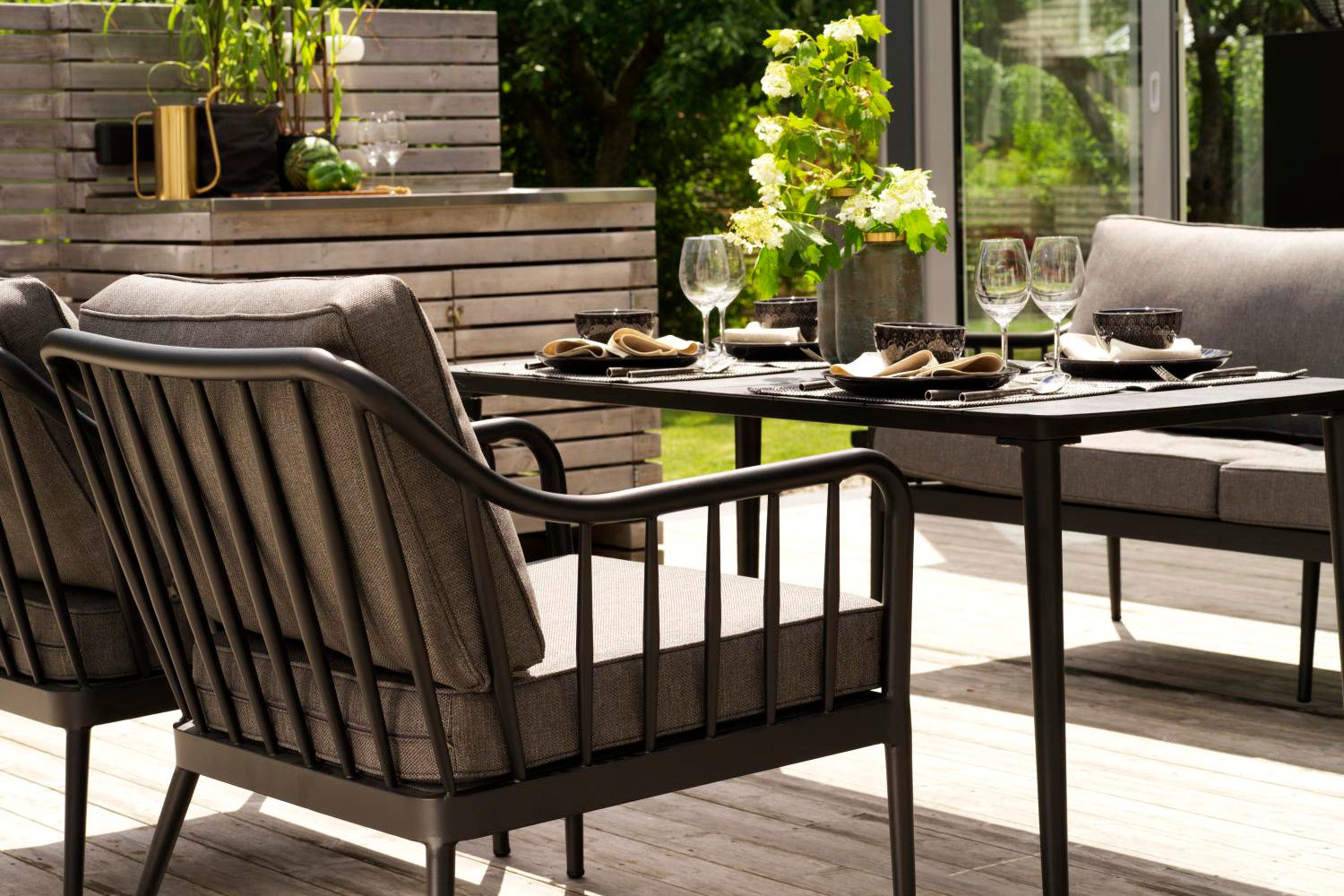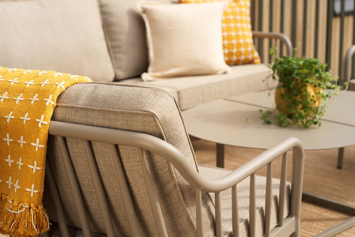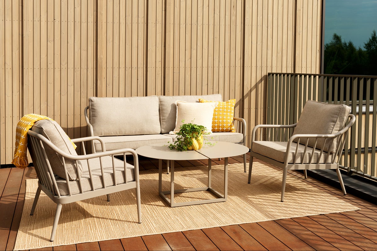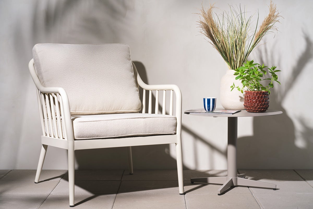 Blød form møder rene linjer i en blanding af klassisk og moderne. Fremstillet af rund aluminiumsprofil med en mat finish, som giver både holdbarhed og elegance. Bløde puder i genanvendt polyester tilføjer komfort og slidstyrke.
