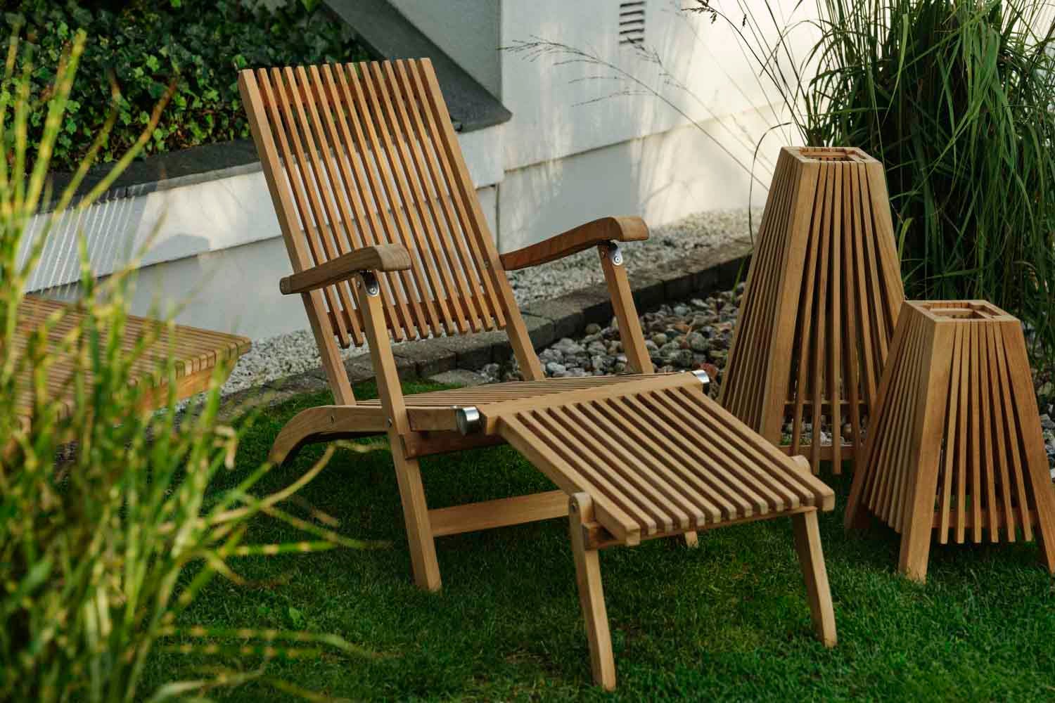 Et smukt premium-sæt med tværgående teak-lameller som gennemgående træk – møblerne har de lige linjer, som er typisk for skandinavisk design og giver en skøn spiseplads, der skiller sig ud samtidig med, at de falder ind i omgivelserne.