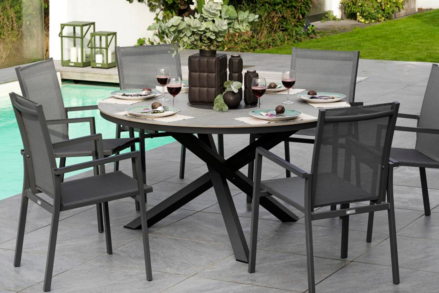 Runt aluminiumbord med en vacker keramisk bordstopp.