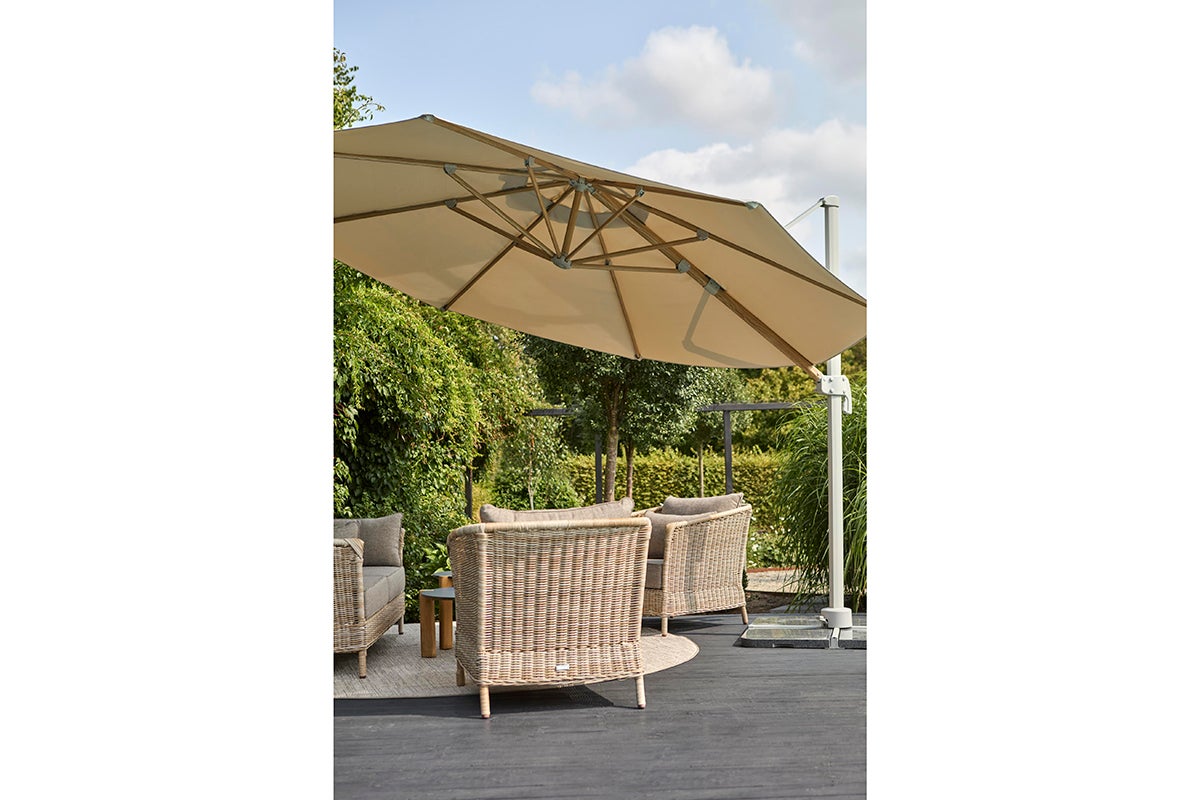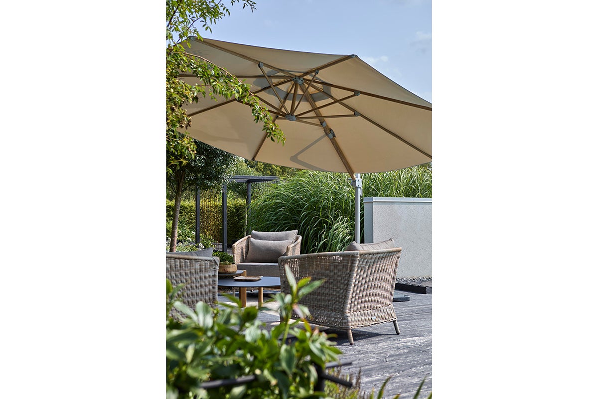 Luzzi parasol har en ramme i sober lys grå. Ribberne er trykt med et smukt trämønster, hvilket giver en varm og indbydende følelse. Luzzi er en fritstående parasol med et 250 g garnfarvet polyesterstof og et aluminiumsstel med håndsving og trinløs kontrol. Basen er inkluderet, men skal forankres med parasolvægt eller lignende.