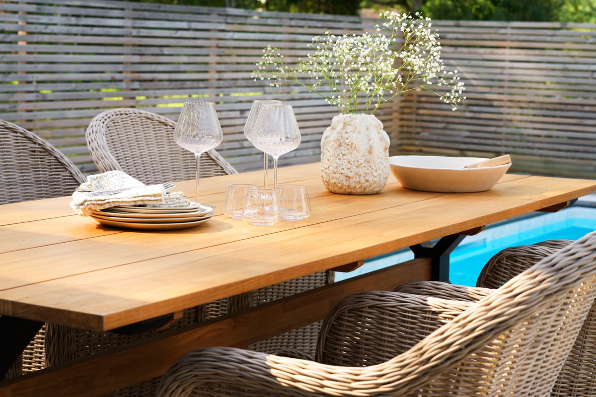 Mark er et spisebord, hvor rustik varme møder industriel følelse. Den massive teaktop er kombineret med krydsben i aluminium og skaber en kraftfuld blanding af naturligt og moderne. Justerbare fødder sikrer stabilitet selv på ujævne overflader.