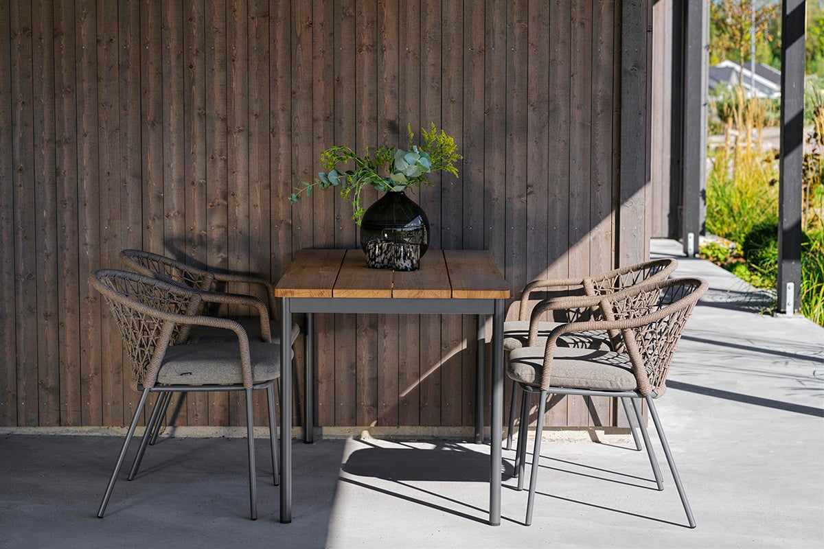 Bordene i Nox-serien giver dig mulighed for at skabe et spisebord helt efter din smag. Vælg enten et færdigsamlet bord med bordplade i teak eller bambus, eller vælg en valgfri ramme og kombiner den med en bordplade i laminat, enten i betonlook eller terrazzo.