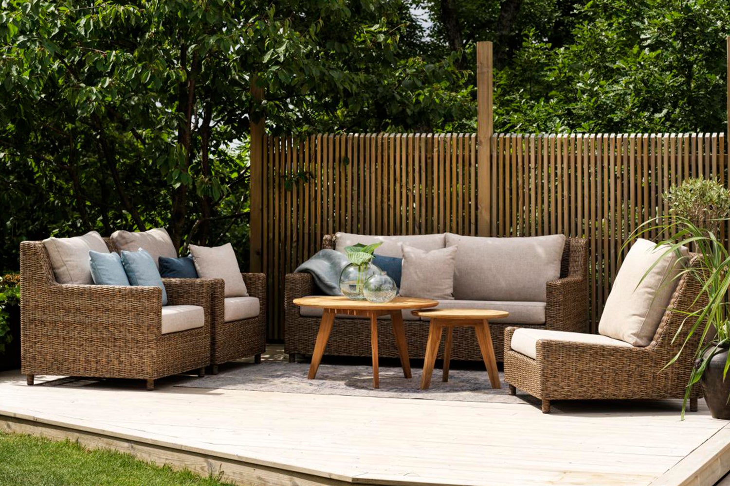 Elegant och måttfullt med inbjudande proportioner i en avslappnad New England-stil. Design med stilrena raka linjer och en ny rustik färg på konstrottingen. Dynor i olefintyg.