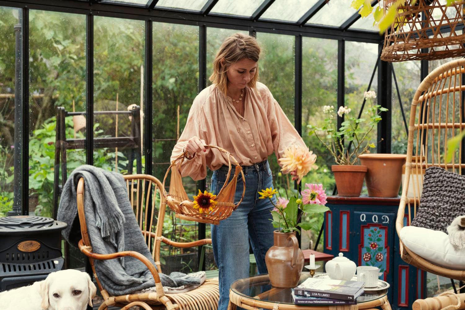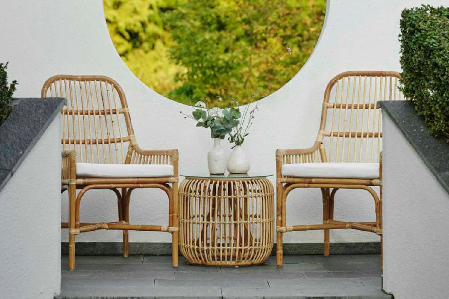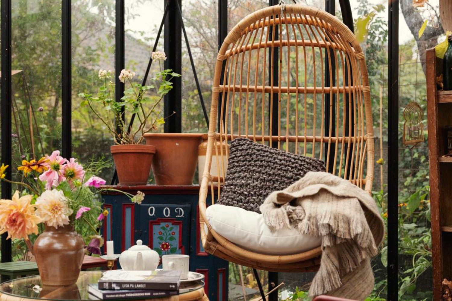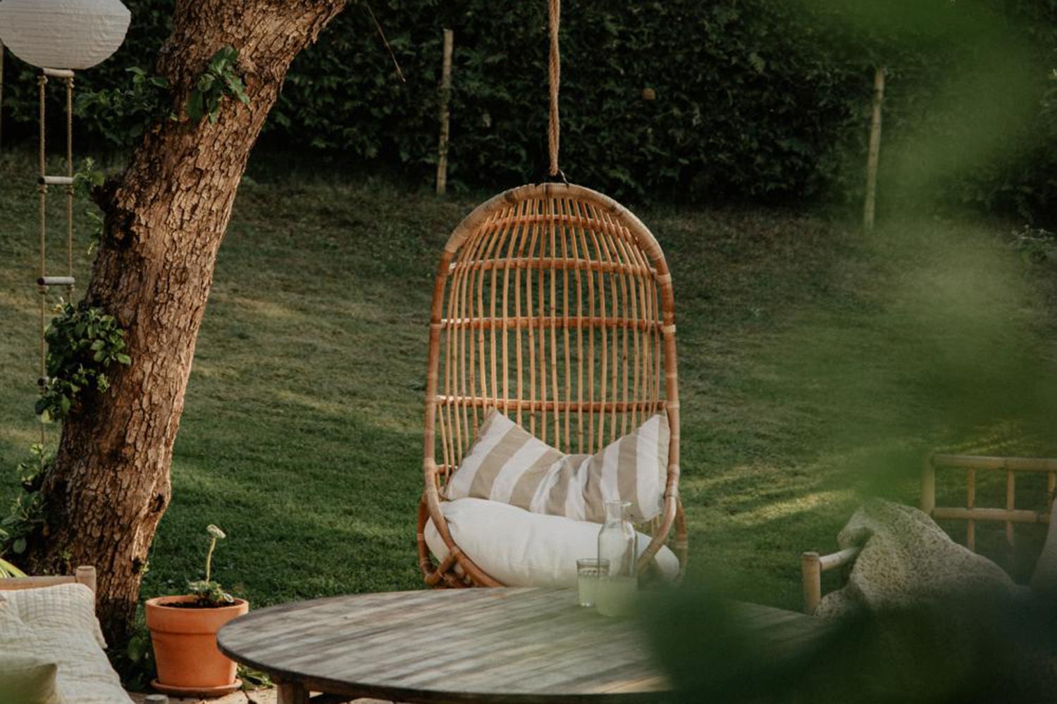 Vallda är en serie med stolar, bord och en hänggunga i naturrotting med fina detaljer.