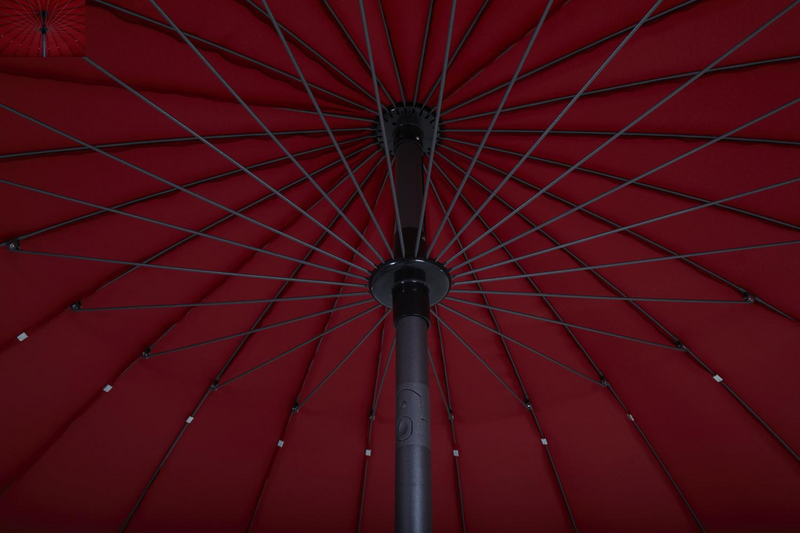 Shanghai er en moderne parasol med en generøs størrelse og 50+ UPF-beskyttelse mod solens ultraviolette stråler. De 2,7 meter i diameter skaber god beskyttelse mod solen. Parasollen har et robust håndsving og en stang, der kan vippes, hvilket gør det nemt at opnå svalende skygge. Når den vippes, kan man se det smukke stålstel – form og funktion i harmoni. Denne parasol giver både stil og funktion til dit uderum. Samlet set alle de funktioner, der er forbundet med en klassisk Shanghai parasol.